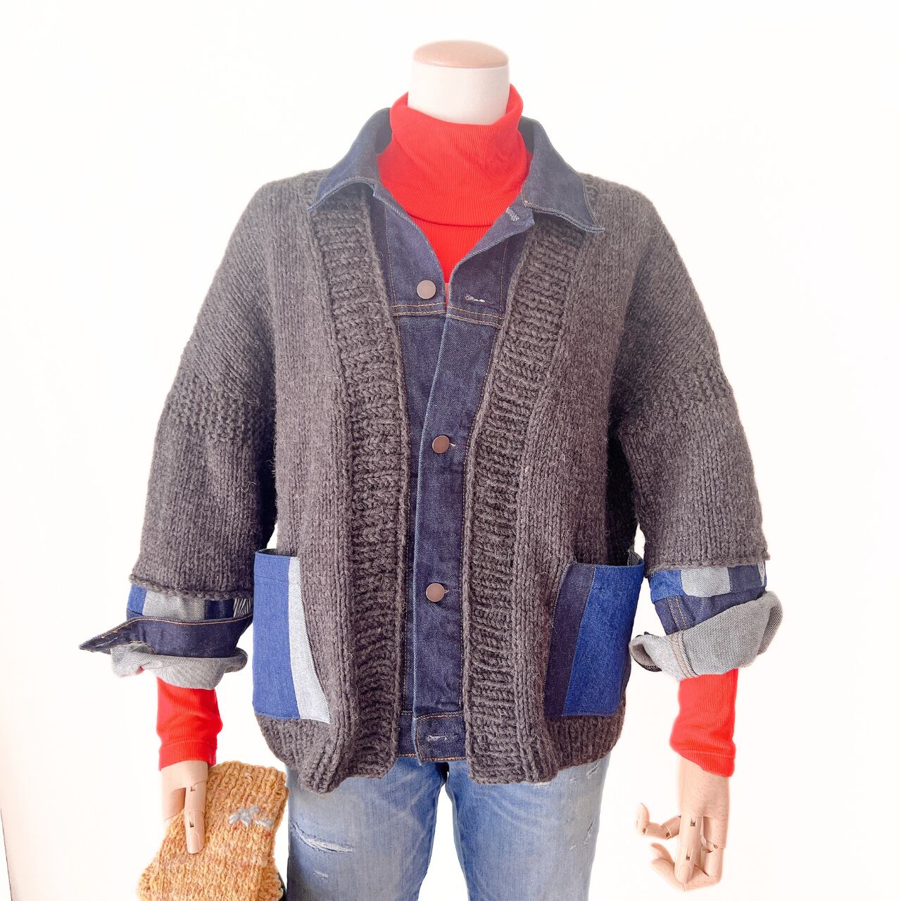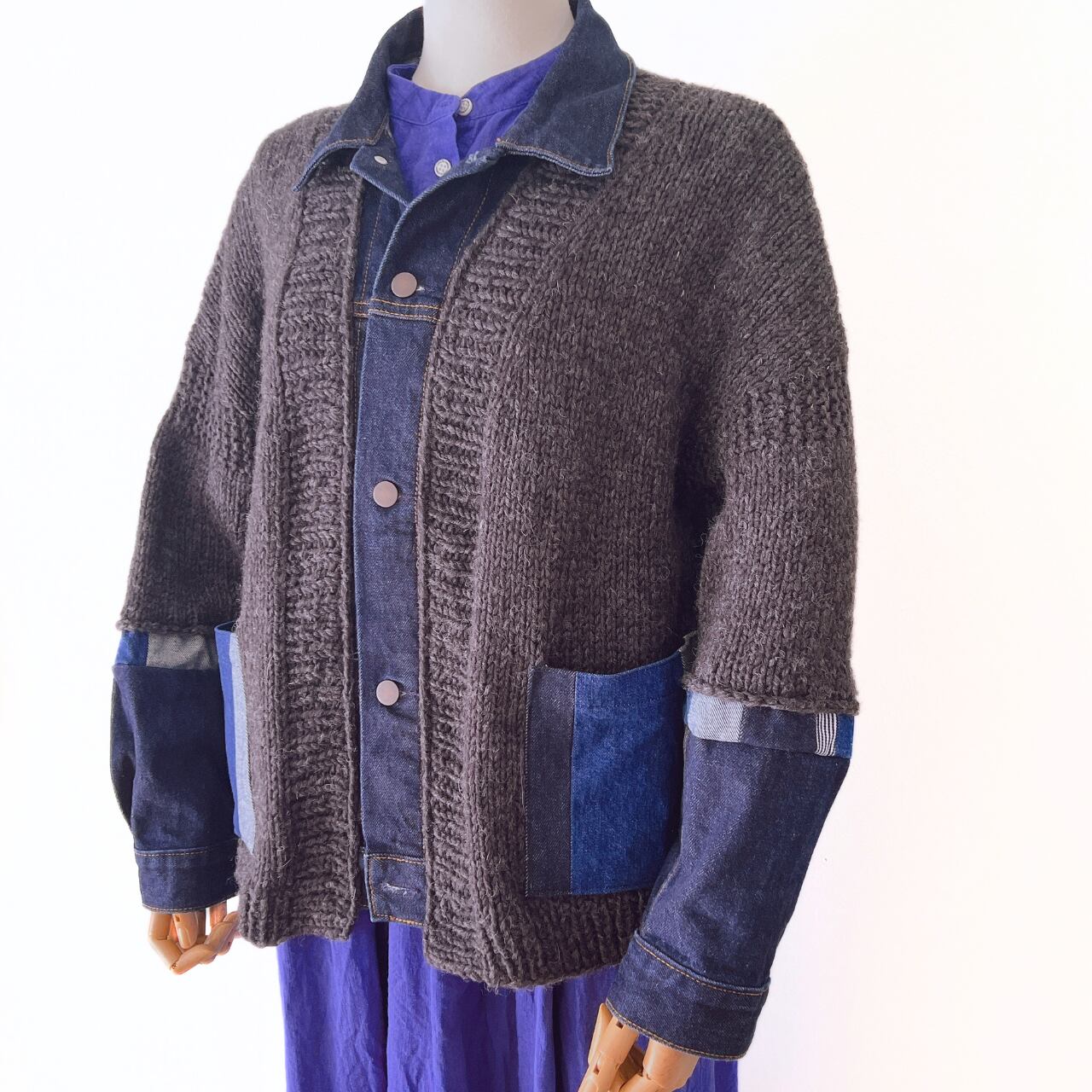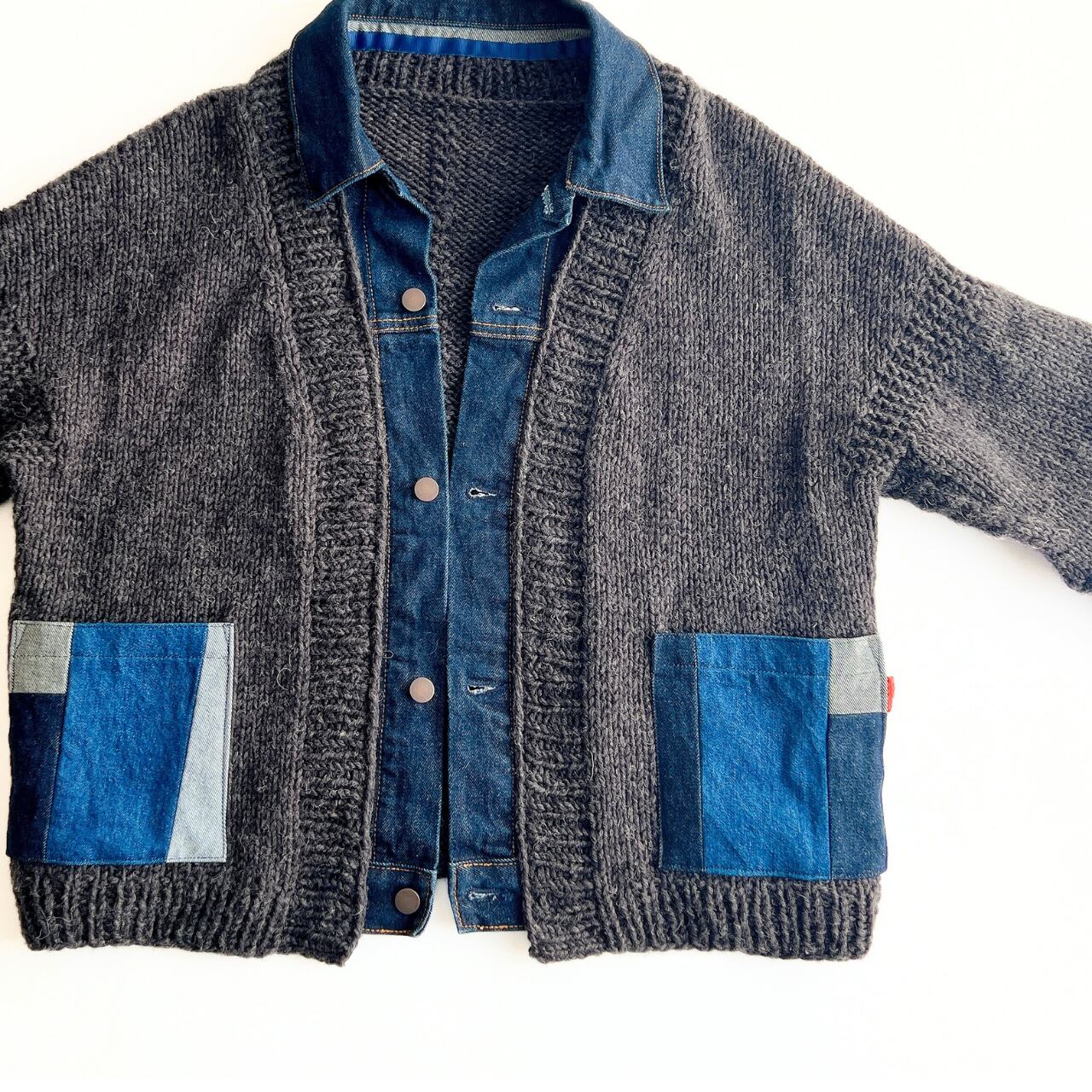 手編みのニットとデニムを合わせたドッキングカーディガン。