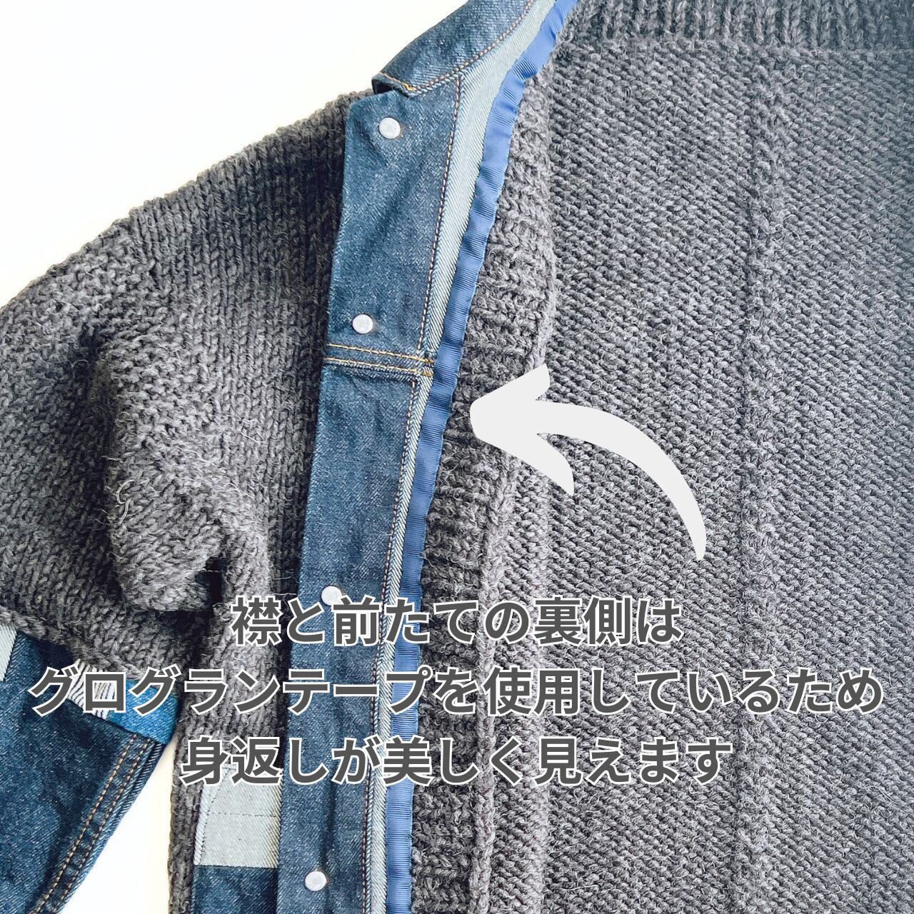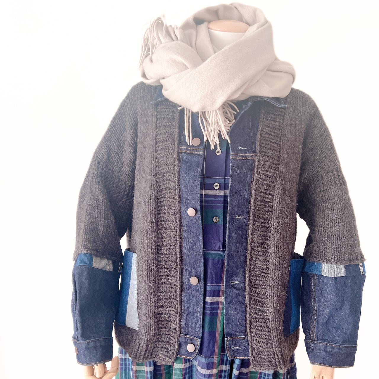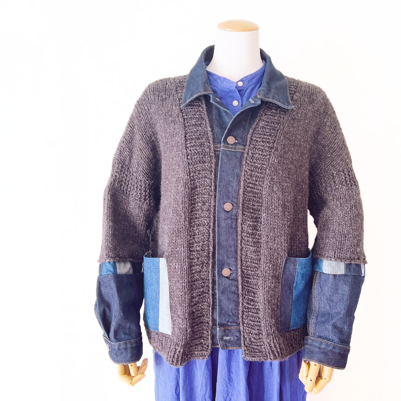 手編みのニットとデニムを合わせたドッキングカーディガン。